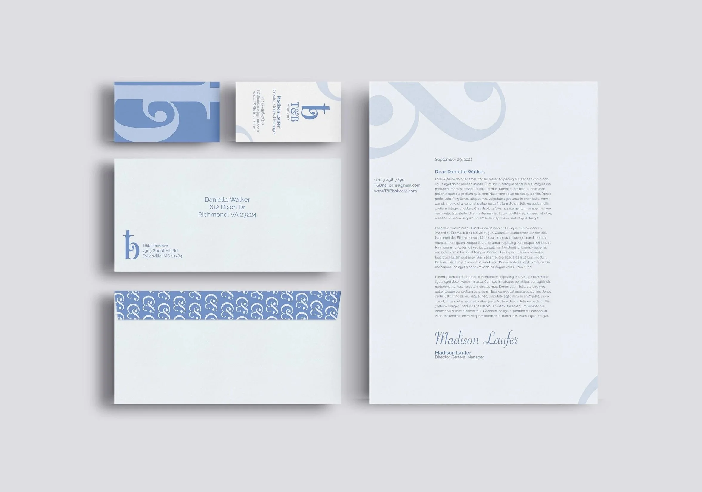 The deliverables for this project include a business card, letterhead, envelope, and bottle/box design. I focused on incorporating the forms and curvatures as key design elements across these pieces to ensure a cohesive look. Drawing inspiration from the Playfair Display font, I used its distinctive ‘&’ symbol to create a unique pattern that represents the brand's identity. This pattern is featured prominently on several of the deliverables, adding a consistent and elegant touch to the overall design.